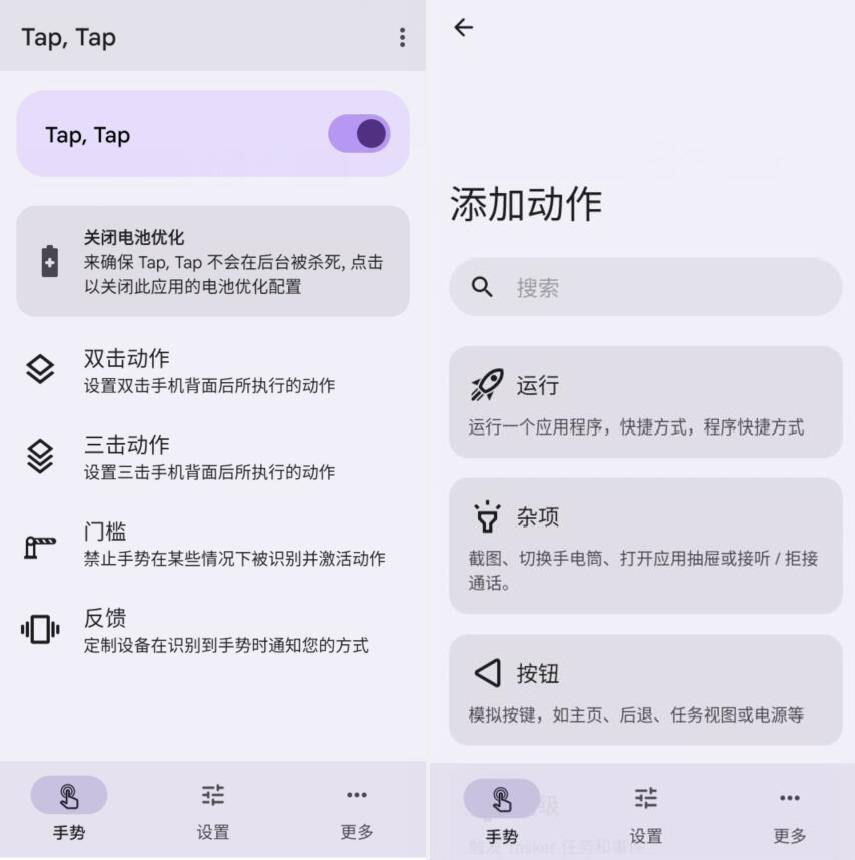 TapTap是一款双击手机背部,就能启动一个应用,执行一个动作或者任务的应用,来自XDA大神,移植自Android 11的新功能,适用于任何ARM v8设备,无需root权限,自带中文界面,让你提前享受Android 11或者MIUI 13的新功能,苹果的iOS 14也有类似的功能,叫作Back Tap。