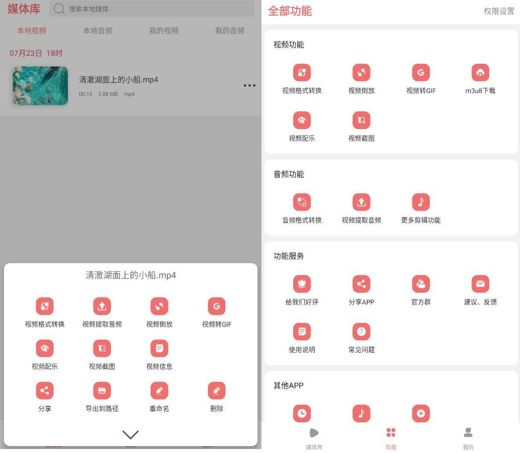 一款音频格式转换器,该软件能对手机中mp4、3gp、avi、mov、fly、mkv、mp3、aac、wav、amr、flac等格式经行指定性转换,并且支持管理本地音视频媒体批量转换,非常实用。此外,它还能设置采样率和比特率,用户可以对视频格式下文件设置帧率(fps)优化播放流畅性。