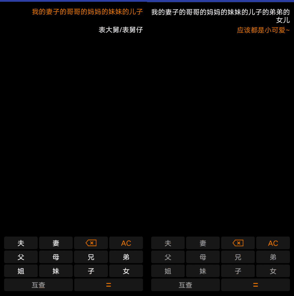 亲戚关系计算器APP专为用户带来的亲戚称呼推理的软件,软件的用法也是非常的简单,通过人物的关系逐步的点击即刻得到称呼,让用户春节等节假日遇到七大姑八大姨或是远房亲戚等直接手机进行计算不用担心因不知道怎么称呼而尴尬,非常的精准,软件的用法简单内存占比也非常的小,单机不用联网也可以使用,打开即刻查询让你走亲访友不尴尬也不再畏惧。