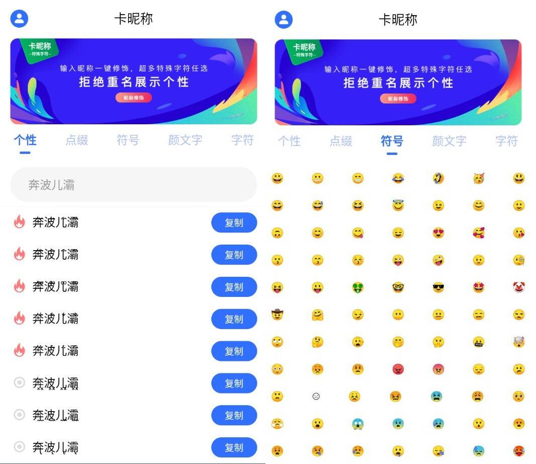 卡昵称 一款特殊符号卡昵称软件,拒绝重名展示您的个性,为您提供了专业的卡昵称工具,可以自动为您的昵称进行加字和点缀,用特殊符号等颜文字,让您的昵称与众不同!