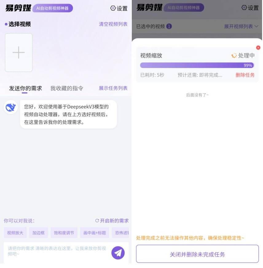 一款纯净无广基于deepseek对话式的AI自动剪视频工具。其只需根据描述的要求以处理命令的形式交给AI自动输出即可,基于DS-V3模型进行分析推理。无需过多复杂操作,适合批量短视频、小白用户粗略剪辑等场景领域。虽然市面上已有相类似功能的app,无奈有限制,故均不在此帖的推荐及讨论范围之内。