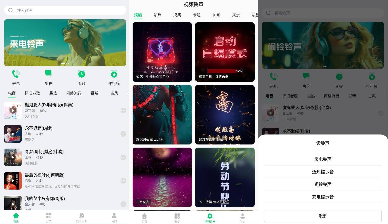 一款提供海量铃声的软件,可以在首页选择你喜欢的铃声、视频铃声等,支持下载和设置充电提示音等功能。解锁会员功能。(别设彩铃要米)