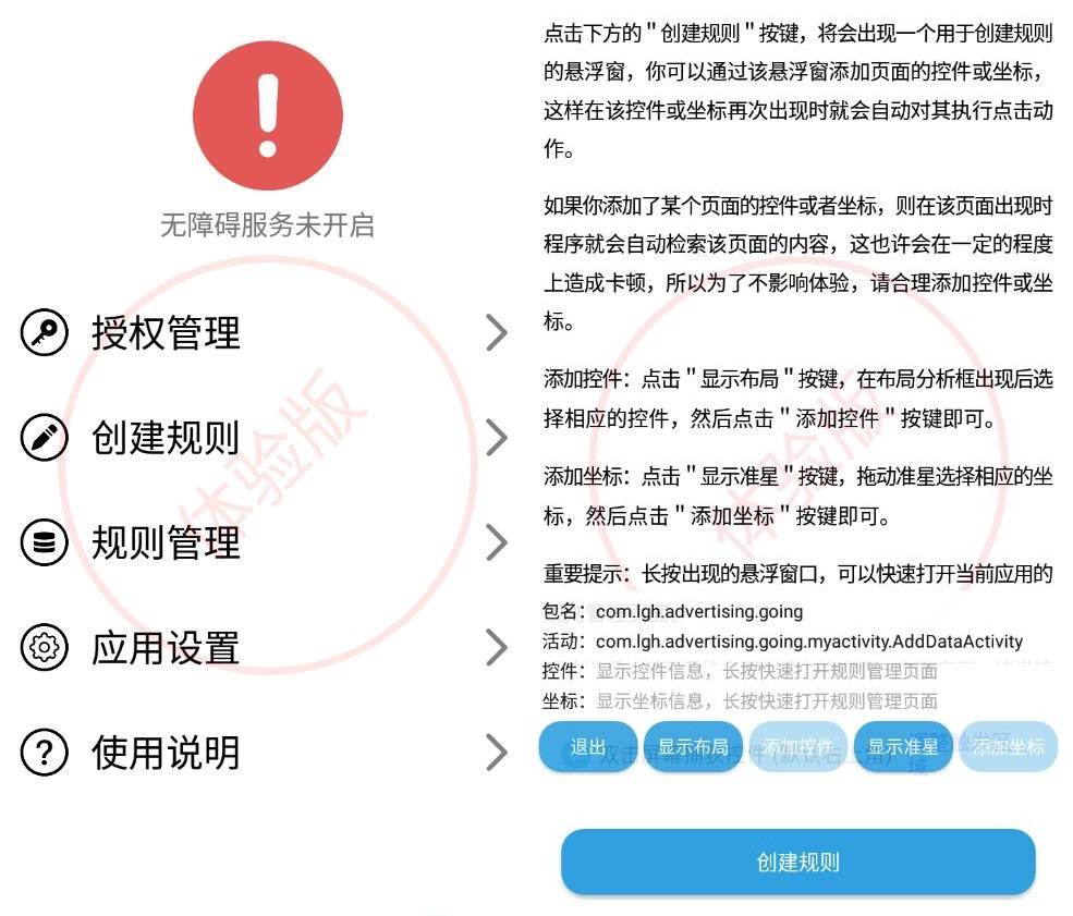原理:通过无障碍服务,按需检索当前页面的控件,如果遇到疑似广告页面的“跳过”控件,则对该控件自动执行点击动作,以实现自动跳过开屏广告的需求。如果有自定义规则,则会在检索到符