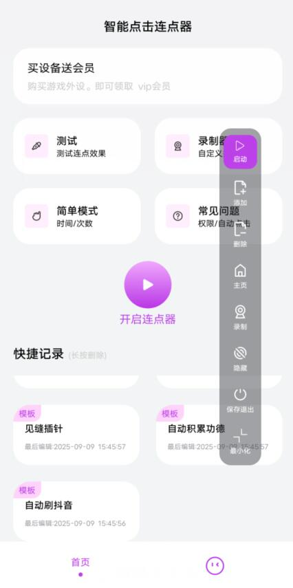 手势录制,功能多样化;有效的制作各种手游和应用辅助脚本,支持屏幕单点点击、多点循环点击、点击加滑动组合等多种手势。让你轻松搬砖、一键挂机!