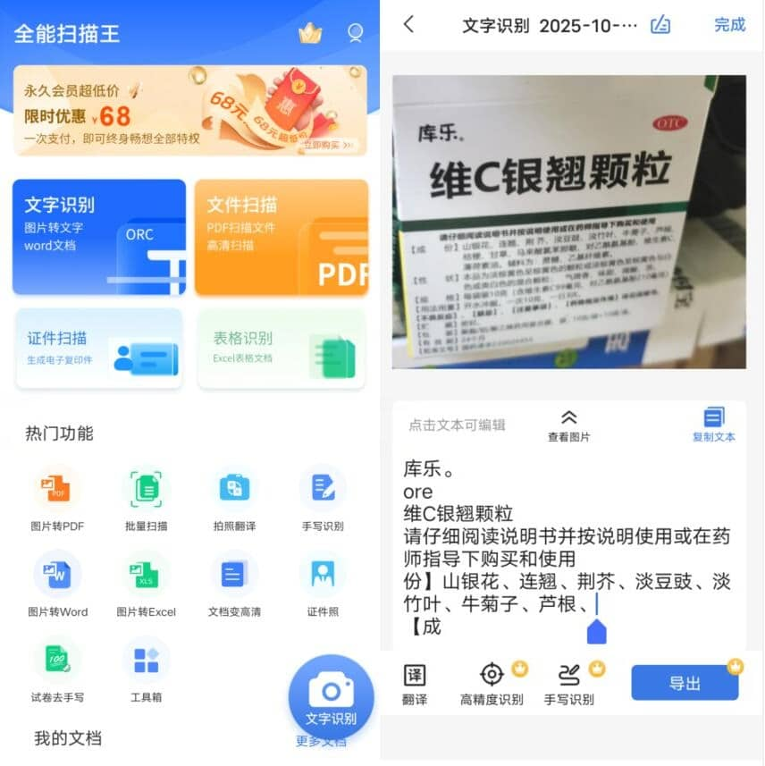 全能扫描王是一款自动识别图片并快速转换文字的App,证件票据一键识别,识别准确率99.9%。图片转文字能够读取相机或相册中的图片,由您指定识别区域,自动转换为文字,是专业的文字识别OCR软件。