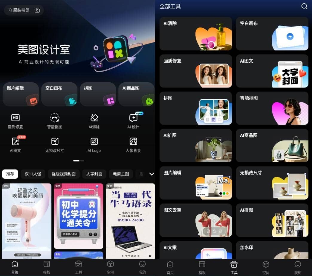 美图设计室为用户提供全面的AI智能作图工具,如AI海报、AI商品图、AI消除等,输入一句话或上传一张图AI即可帮你完成设计。更有丰富的商用海报模板,只要“改字换图”就能快捷生成手机宣传海报、自媒体封面等设计物料。让设计更高效。