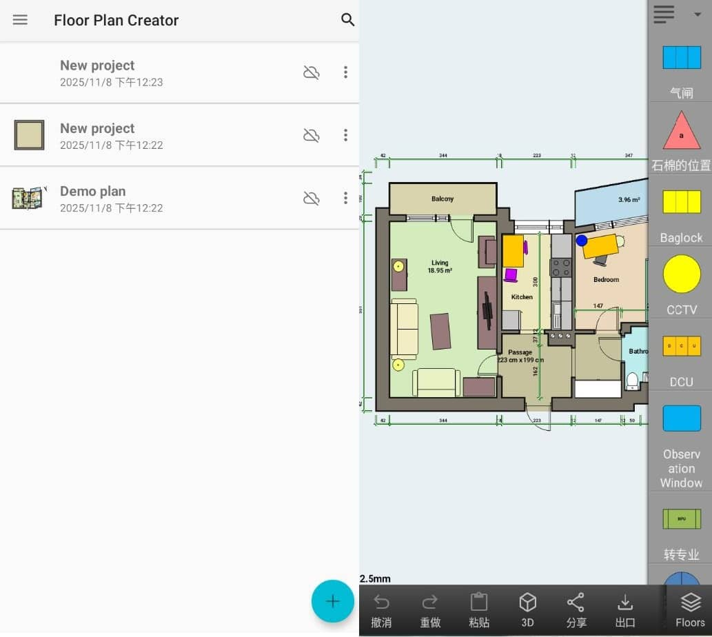 * 项目可以有多个楼层和任何形状的房间(仅限直墙)。
