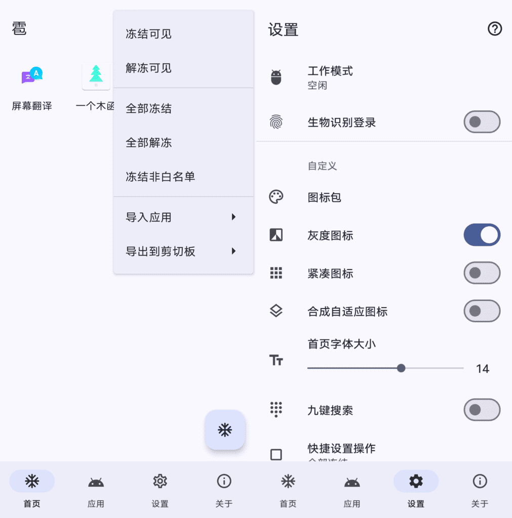 雹是一款用于冻结 Android 应用的冻结应用工具软件,主要就是启动系统优化加速的作用,您可以通过本软件来冻结一些频繁启动的app,然后在需要使用的时候在解冻,这样可以启动省电的作用!【冻结】是一个营销用语,用于描述使应用在用户不需要时不可运行的行为,以此控制设备使用、减少内存占用和节省电量。用户可在需要时【解冻】应用。通过【隐藏】和【停用】两种方式,都能达到所谓冻结的效果,但其实现存在差异。